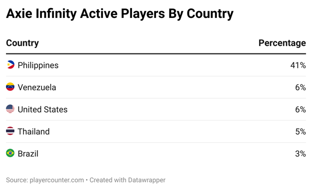 What makes play-to-earn games particularly interesting is that unlike other jobs, wages are not dependent on one’s location. Axie Infinity players all earn the same amount of SLP per win, no matter where in the world they live. While $400 may not mean much to a player in the U.S, it is 2x the minimum wage in the Philippines. It is therefore no surprise that the game has gained most of its traction from emerging markets.