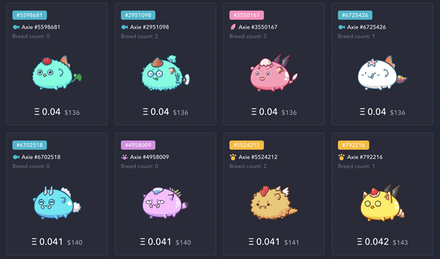 New players have to purchase three Axies from a seller in order to play the game; sellers are people who either previously bought Axies or who bred new Axies. “What? People can breed new Axies?” you may ask. Yes, the game allows anyone with two Axies to breed new ones. However, in order to do that, they have to pay some SLP, the currency players earn whenever they win battles against other players, or complete quests within the game.