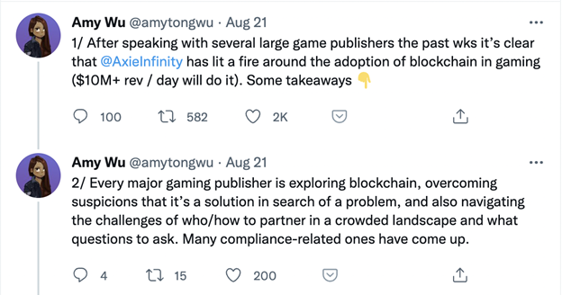 To be fair, we are still at the outset of this new technological paradigm and the playbook for long-term success has not yet been written. We are also likely to see many more play-to-games released in the coming months, as more publishers attempt to emulate Axie Infinity’s success, each with their own adaptations. Emmett Shear, the co-founder and CEO of Twitch put it aptly on his recent appearance on Justin Kan’s Youtube channel: “I don’t think what Axie Infinity is doing right now is sustainable but they have a solid base to pivot into something that is meaningful”.